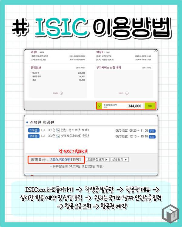 ✅ ISIC.co.kr로 들어가기 > 학생증 발급란 > 항공권 메뉴 > 실시간 항공 예약 및 상담 클릭 > 원하는 국가와 날짜 인원수를 입력 > 항공 요금 조회 > 항공권 예약