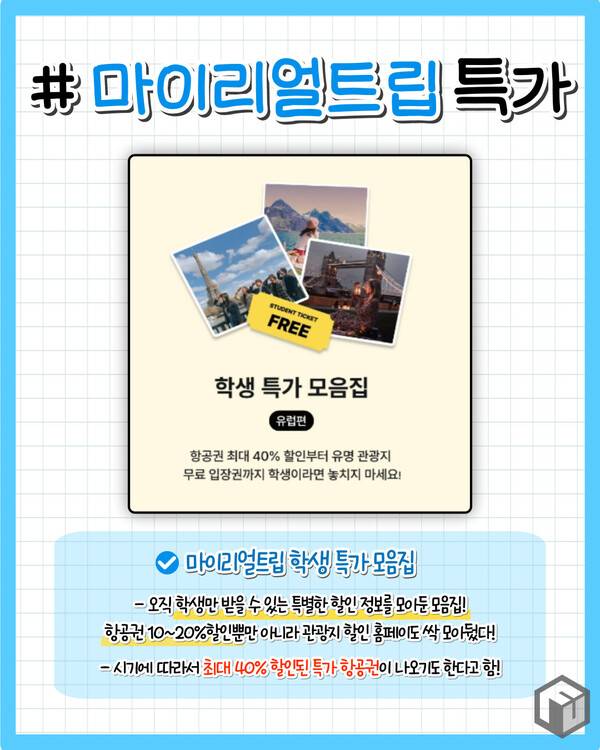 위 2가지 방법이 번거롭다면 추천드리는 방법이 바로 마이리얼트립의 학생특가 모음집입니다. 학생특가 모음집이란 오직 학생에게만 제공하고 있는 특별한 할인 정보를 모아둔 모음집으로 항공권부터 학생 할인이 가능한 곳을 한 눈에 볼 수 있습니다.