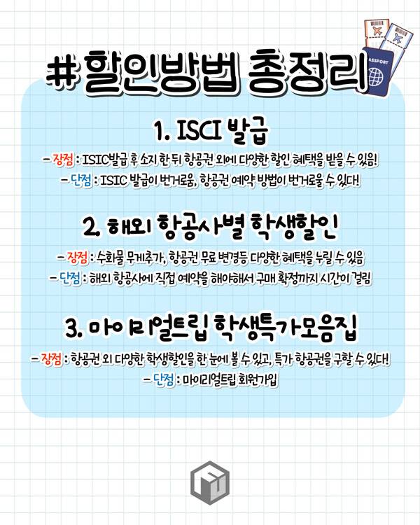 그래서 오늘은 이 같은 비행기표 할인 방법 3가지와 그 외 대학생이면 누릴 수 있는 해외여행 꿀팁을 준비했으니 다가오는 여름방학 해외여행 계획이 있으시다면 도움이 되셨으면 좋겠습니다.