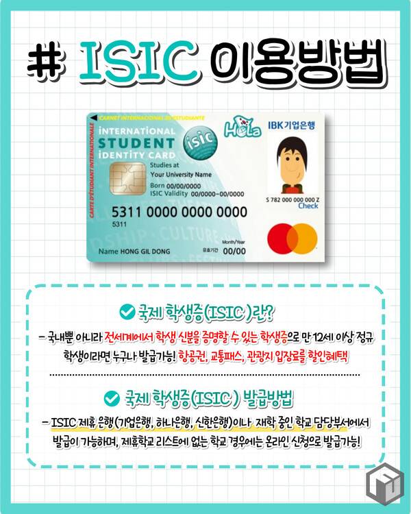국제 학생증(ISIC)는 국내뿐 아니라 세계에서 학생 신분을 증명할 수 있는 학생증이라고 볼 수 있으로 만 12세 이상의 정규 학생이라면 발급받을 수 있습니다.