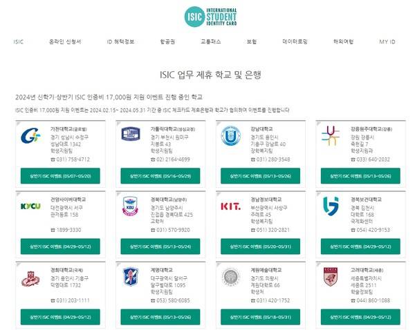 일반적으로 ISIC는 한국 대표부 KISES, ISIC 제휴 은행(IBK기업은행, 하나은행, 신한은행), 그리고 ISIC 제휴 학교 담당부서에서 발급이 가능합니다.