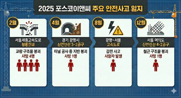 실제 지난해 포스코이앤씨 현장에서는 중대재해가 끊이지 않았다. 2월 서울세종고속도로 안성~구리 구간 9공구(청룡천교) 현장에서 교량 구조물 붕괴로 4명이 사망한 데 이어 4월에는 경기 광명시 신안산선 5-2공구 터널 공사 중 지반 침하로 작업자 1명이 목숨을 잃었다.