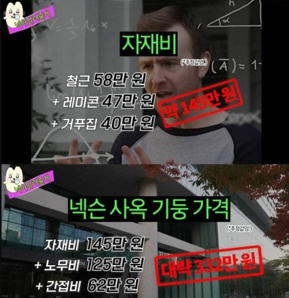 넥슨 측은 "여기서 끝이 아니다”라며 “거푸집을 설치하고 콘크리트를 붓는 타설 작업과 거푸집을 다시 해체하는 것도 사람이 하는 거니까 노무비가 들어간다"고 했다. 그러면서 "여기에 고용·산재 보험료, 환경 관리비, 가설 사무실 유지비, 세금 등과 같은 간접비도 발생했겠다”고 전했다. 기둥 하나를 세우는데 든 노무비는 125만원, 간접비는 62만원으로 추정한다. 따라서 앞서 자재값과 합하면, 결과적으로 넥슨 사옥 기둥 하나의 가격은 약 332만원이라는 계산이 나온다.