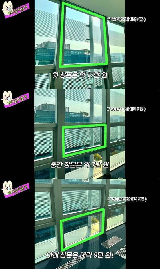 창문 하나를 만드는 데는 얼마나 들었을까. 넥슨 측은 사옥 외관 세로 유리 창문 하나의 가격을 알아봤다. 윗 창문은 약 17만원, 중간 창문은 약 7만원, 아래 창문은 약 9만원으로 총 33만원이 든 것으로 추정된다. 이 금액 역시 2013년 정산 내역을 기준으로 산정했다.