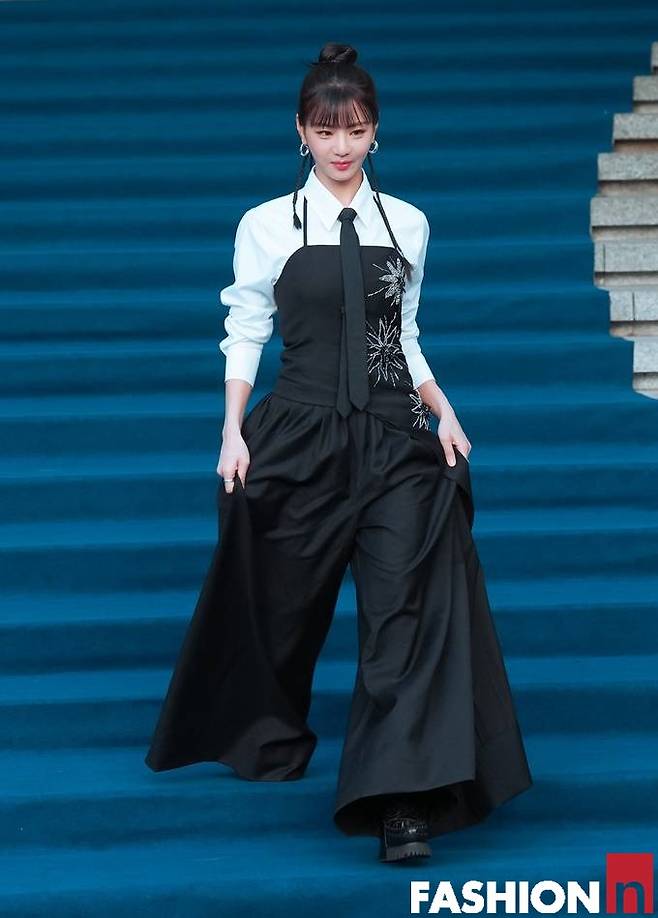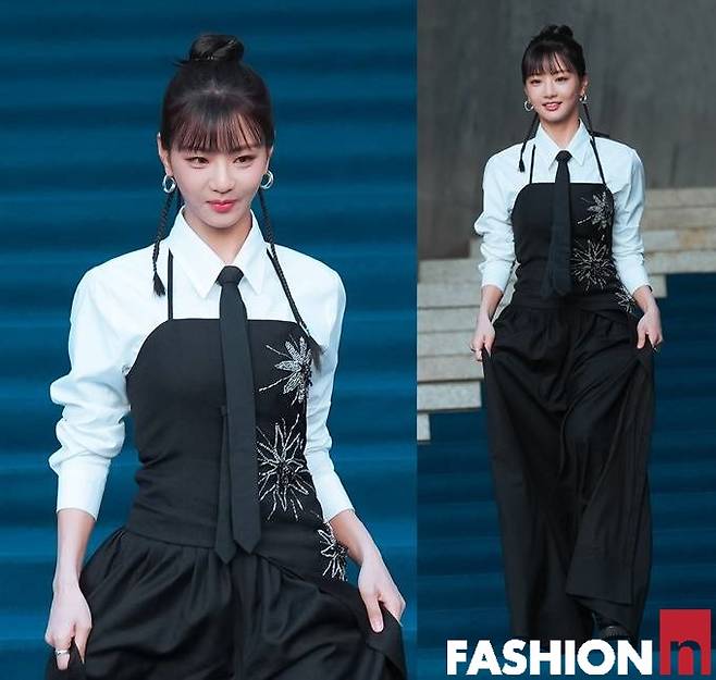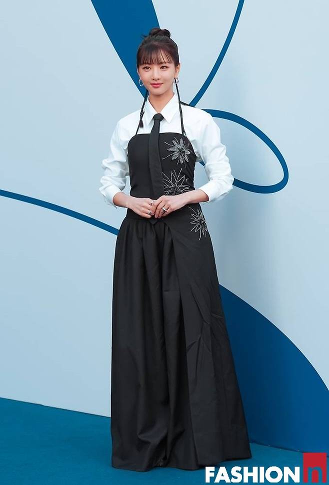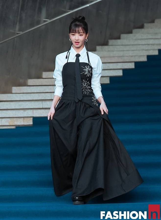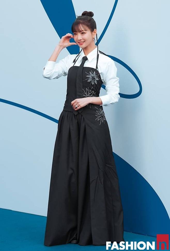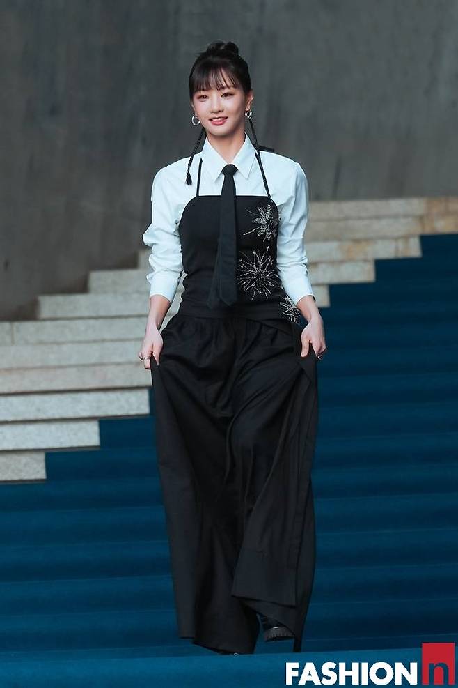배우 이세희가 셔츠&타이를 매치한 시크한 오버롤 드레스룩으로 서울패션위크를 밝혔다.