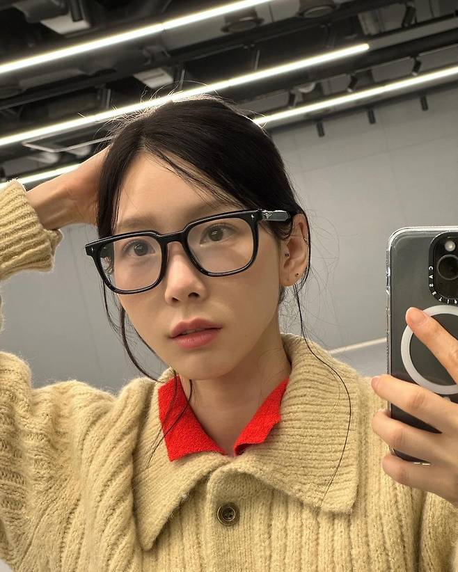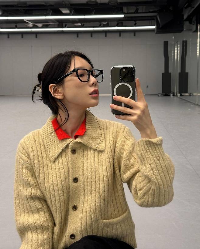 공개된 사진 속에서는 태연은 빨간 카라티에 니트 가디건을 걸치고 블랙 팬츠를 입고 뿔테 안경을 매치하여 동안 미모를 자랑했다.