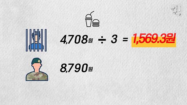 먼저 의식주 가운데 집은 감옥이니까 일단 빼고 식비와 의류비를 살펴보자. 감옥에서 죄수 1명당 하루에 드는 급식비 단가는 하루 세 끼 4708원이다. 같은 해 군대 급식 1인당 예산으로 책정된 8790원의 53.5%로 한 끼당 1569.3원이다.