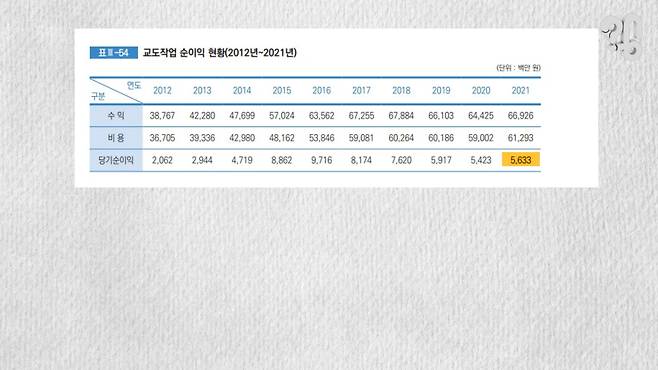그렇다면 시민들 세금으로 먹고 자는 대가로 수감자가 치르는 비용은 없을까. 굳이 따지자면 있다고 볼 수도 있다. 수감자들의 노동으로 국가가 얻는 순수익, 다시 말해 교도작업 당기순이익은 2021년 기준 56억3300만원이다.