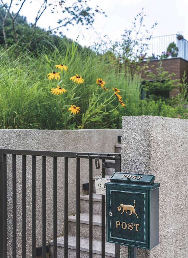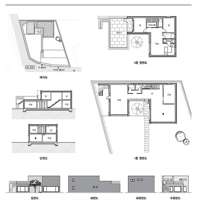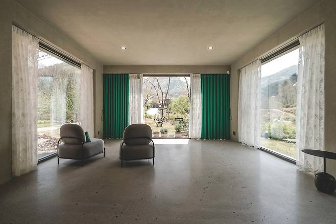 산의 정직하고 고요한 형상을 녹이고, 건물의 양감을 고양시키기 위해 묵직한 덩어리로 구성했다. 작은 규모의 건축이라도 그 안에서 유영하는 사람들로 하여금 대지와 건축, 빛의 농담이 빚어내는 긴장과 감동의 순간들을 경험하게 하기 위해 동선과 정주의 공간을 뚜렷하게 배치했다. 그리고 대지 옆을 흐르는 도로의 속도를 늦추기 위해 왕벚꽃나무와 관목들로 여과시켜 대지에 들어서는 순간에는 찾는 이들에게 느린 시간을 선물하려 했다.