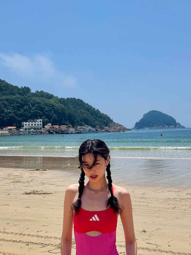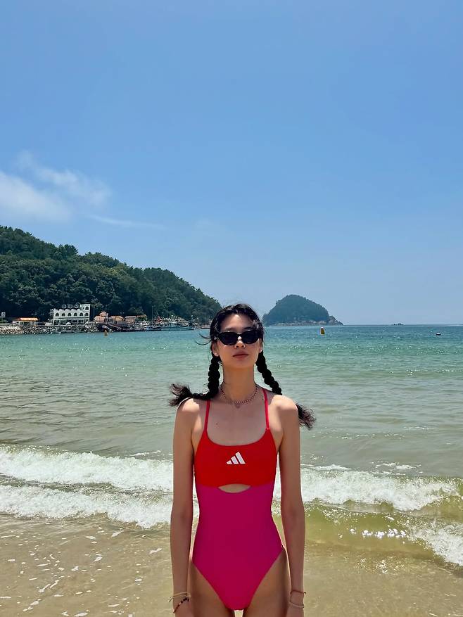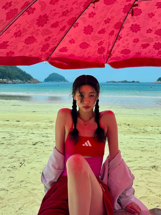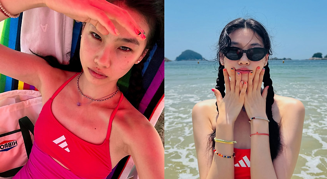 핫핑크와 레드가 조화를 이룬 스포티한 수영복, 러블리하게 땋은 양갈래 머리, 그리고 자유로운 표정 모든 순간이 정호연표 ‘여름 스타일링’의 정답이다.