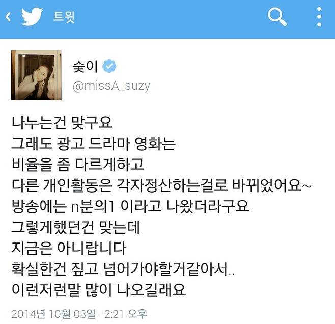 일각에선 당시 수지의 수입을 멤버들이 ‘n분의 1’로 나눠갔다고 주장했고, 실제로 수지는 “그 구조에 대해 서운함을 느낀 적 있다”고 언급한 바 있다.