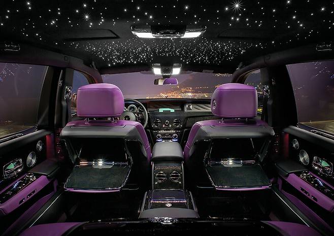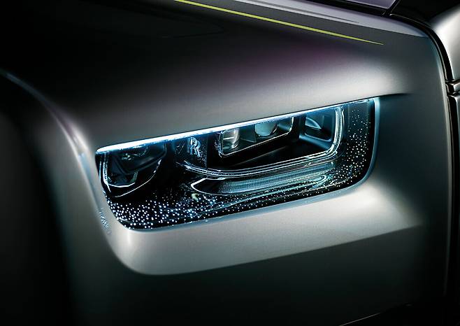 그의 얘기를 들으니 이전 팬텀과는 또 다른, 새로운 특별함을 지닌 두 대의 팬텀이 더욱 빛나 보였다. 고객의 주문을 반영하고 고유의 가치를 잃지 않으면서도 팬텀은 진화하고 있었다. 가장 눈에 띄는 것은 고객의 의견을 반영한 ‘라이트 터치’ 디자인. 팬텀 시리즈 II는 판테온 그릴과 주간 주행등 사이에 수평으로 일직선을 이루며 그릴에 라이트가 켜지는 기능을 새롭게 추가했다. 그릴 자체가 조명 효과를 발휘해 해가 지면 메탈 소재 그릴에 라이트가 반사되어 은은하고 우아하게 빛나는 모습이 매혹적이다. 헤드라이트에도 별빛처럼 수만 개의 복잡한 레이저 컷 베젤을 적용해 어두운 밤에도 롤스로이스의 상징인 RR 배지와 환희의 여신상을 돋보이게 하며 웅장하고 압도적인 존재감을 뿜어낸다. 이 헤드라이트는 디자인팀의 숙제 같은 부분이기도 했다. 롤스로이스 모터카의 비스포크 수석 디자이너 매슈 댄턴(Mattew Danton)은 팬텀 실내 천장에 드러나는 스타라이트를 밖에서는 볼 수 없을까 고민했다고 한다. “팬텀의 눈이라고 할 수 있는 헤드라이트에 별을 새겨 넣기로 했죠. 그래서 레이저를 활용해 별빛을 추가했어요. 예전의 타원형에서 원형으로 바꾸고 3D 레이저를 활용해 한쪽 헤드라이트당 580여 개의 별을 수놓을 수 있었습니다. 단순히 반사하는 것이 아니라 아주 은은하게 발광하죠.”
