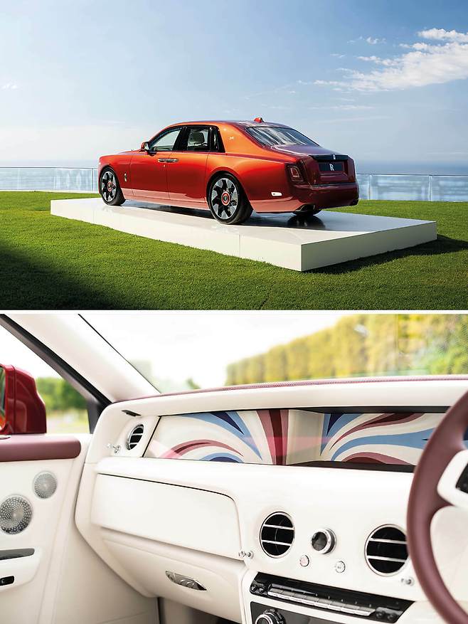 호텔 정원에 전시한 새로운 팬텀은 두 대의 더 비스포크 모델. 그중 하나는 플래티넘의 은백색 마감에서 이름을 본뜬 ‘더 플래티노(The Platino)’로, 팬텀 시리즈 II 출시를 기념해 특별 제작한 모델이다. 앞좌석은 최고급 가죽으로, 뒷좌석은 고급스러운 직물로 덮여 초창기 롤스로이스를 떠올리게 한다. 이 모델과 강렬한 대비를 이루는 또 하나의 비스포크 샘플로 선보인 모델을 ‘더 패트리어트(The Patriot)’라 이름 붙였다. 영국 국기 유니언잭에서 영감을 받아 선명한 마그마 레드 컬러로 마감하고, 굿우드의 디자이너가 그린 작품으로 장식해 영국적 멋이 느껴진다.