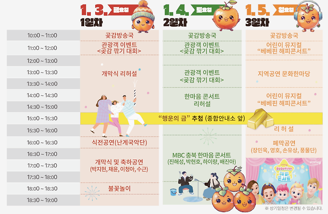 개막식 다음 날인 1월 4일에는 MBC충북 한마음콘서트가 열려 추운 겨울을 뜨겁게 달궈줄 예정이에요. 그리고 축제의 마지막 날인 1월 5일에는 아이들을 위한 ‘베베핀 해피콘서트’ 어린이뮤지컬이 준비되어 있어요. 남녀노소 모두 즐길 수 있는 공연들이 매일 달라 지루할 틈이 없답니다.