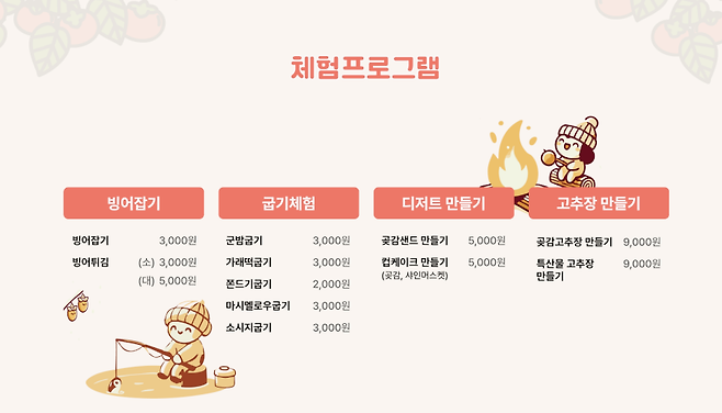 이 밖에도 빙어잡기 체험, 군밤·군고구마·가래떡 체험, 곶감 디저트 만들기 체험, 곶감 고추장 만들기 체험 등 즐길 거리가 가득해요. 다만 체험 프로그램은 대부분 유료이므로 현장에서 요금을 확인하시거나 공식 안내를 미리 살펴보시면 좋아요.