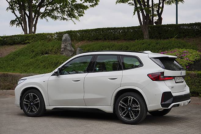 측면에서는 도어 패널을 가로지르는 캐릭터 라인이 직선형 대신 억양으로 바뀌었지만, 뒤쪽 추가 차대와 스포일러 등으로 날카롭게 처리했다. 랜드로버가 이보크를 선보인 이후 많은 SUV들이 쿠페라이크한 루프라인을 벤치마킹하고 있는데 X1도 그 부분에서는 예외가 아니다. 17인치 알로이 휠이 기본인데 시승차에는 19인치 사양이 조합되어 있다. 여전히 차체에 비해 큰 휠 하우스와 큰 휠이 당당한 자세를 만들고 있다. 공기저항을 줄이기 위해 도어 핸들의 디자인에도 변화를 주었다. 20인치 알로이 휠도 옵션으로 설정되어 있다.