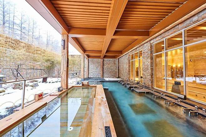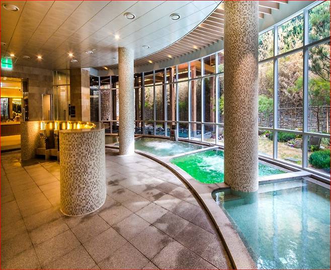 실내 탕과 사우나 역시 통유리 구조로 설계되어 있어, 실내에서도 바깥 풍경을 감상하며 온천을 즐길 수 있습니다. 히노끼탕, 드림베스, 넥샤워, 벤치젯, 종아리 마사지 등 다양한 수중 마사지 시설이 마련되어 있어, 단순한 목욕을 넘어 휴식에 집중할 수 있는 구성입니다.