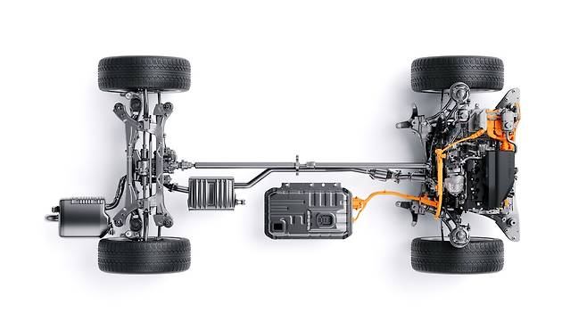 e-AWD는 전자식 사륜구동 시스템으로 전륜 기반 하이브리드 차량의 후륜 구동축에 구동 모터(P4)를 추가해 주행성능과 가속 응답성을 향상시킨다.