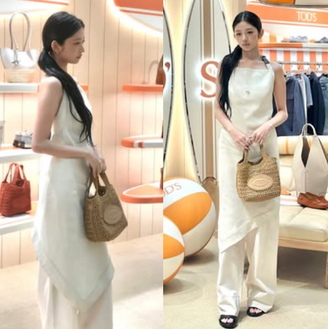 아이브 레이 님은 이마를 깔끔하게 드러내고 아래로 묶은 헤어스타일로, 시크하면서도 세련된 매력을 발산했어요. 민무늬의 민소매 크림색 롱원피스와 크림색 팬츠를 매치하여 트렌디하면서도 고급스러운 룩을 완성했습니다. 여기에 블랙 쇼퍼백을 더해 룩에 세련된 포인트를 추가했죠.