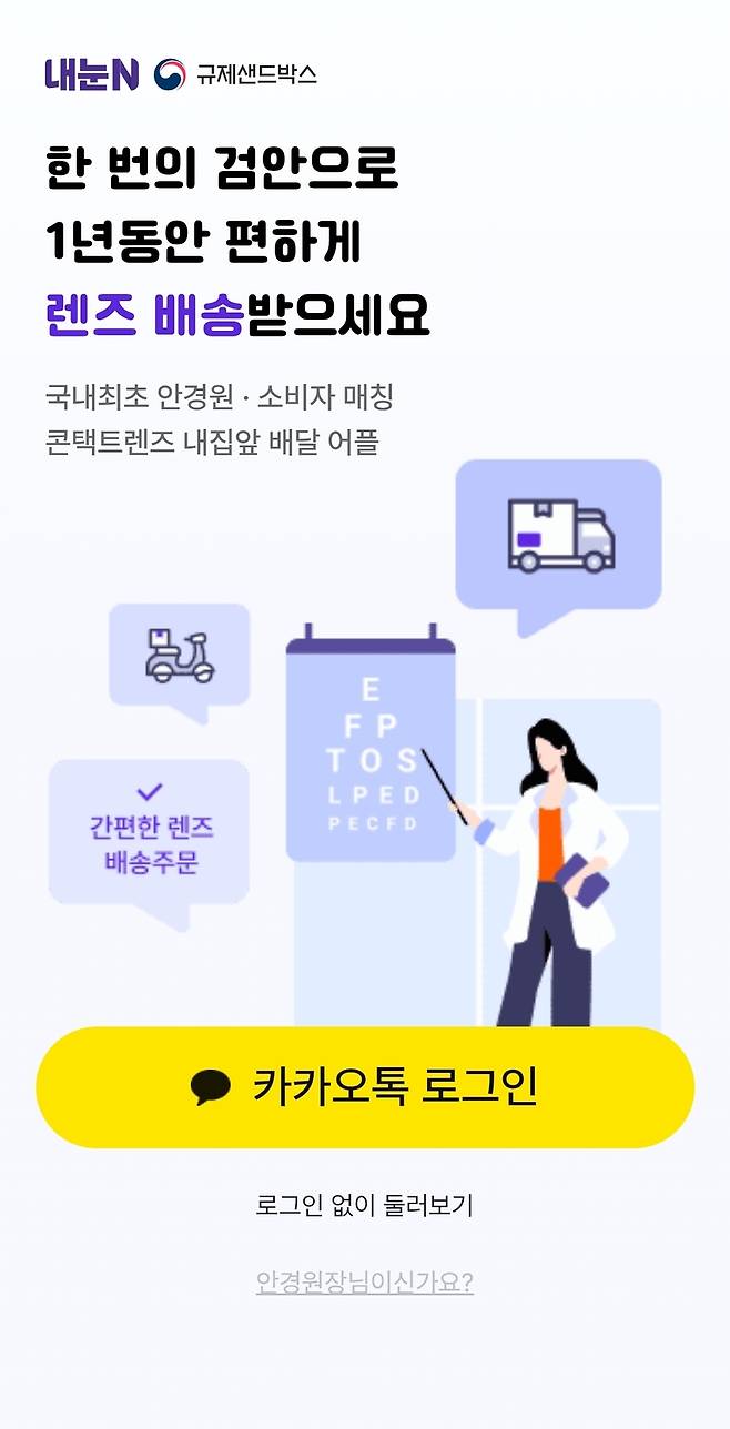 소비자가 앱 배송서비스를 이용하기 위해선 처음 렌즈를 구매하는 경우는 제외되고, 이용하던 안경원에서 1년 이내에 검안과 구매 이력이 있어야 합니다.