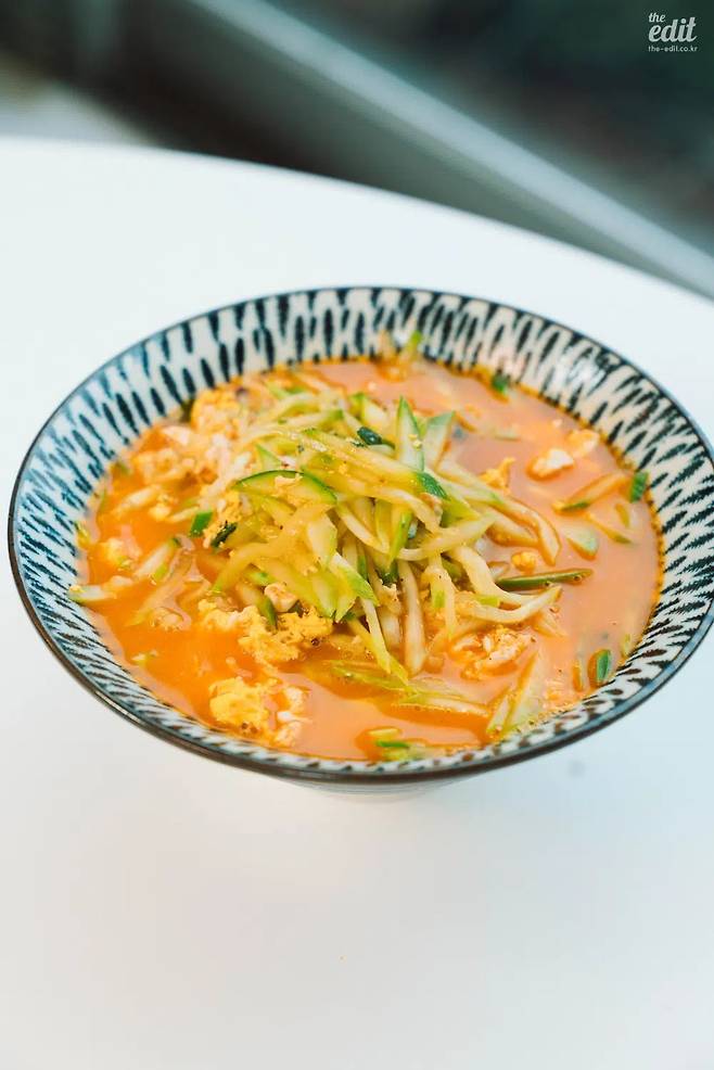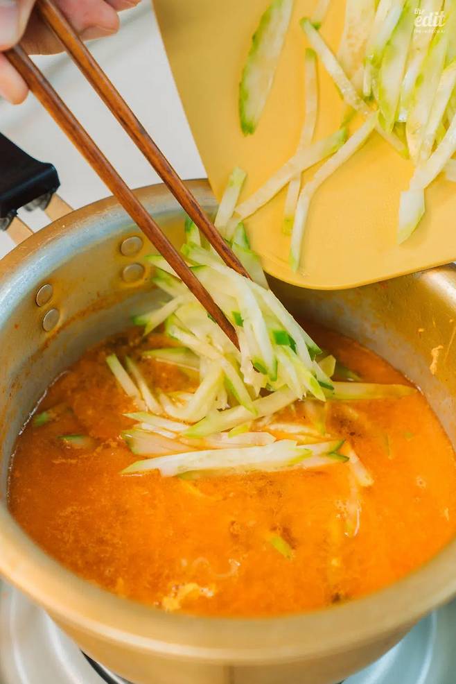 그리고 불을 끈 후, 아까 썰어두었던 오이채를 국물에 넣는다. 여기서 포인트는 불을 끈 상태로 오이를 넣는 것. 잔열에 의해 오이가 살짝 익으면서 아삭한 식감은 살고, 오이의 시원한 맛과 향은 국물에 스며든다.