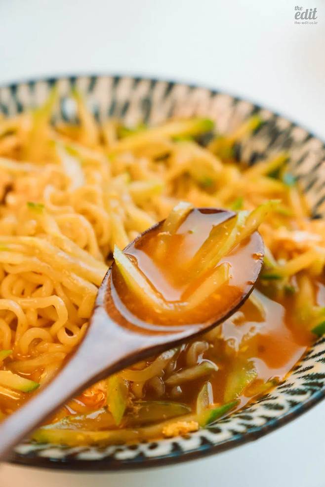 우선 국물부터 한 입 떠먹어봤다. “어, 되게 깊은 맛이 나는데?” 아무것도 넣지 않고 끓인 오리지널 라면과 국물 맛이 확실히 다르다. 들기름의 고소함과 오이에서 우러나온 시원함. 마치 콩나물국밥이 생각나는 맛이다. 라면 국물 한입에 이렇게 속이 확 풀린다니. 오이의 아삭한 식감도 그대로 살아있다.