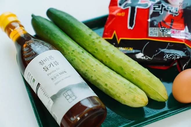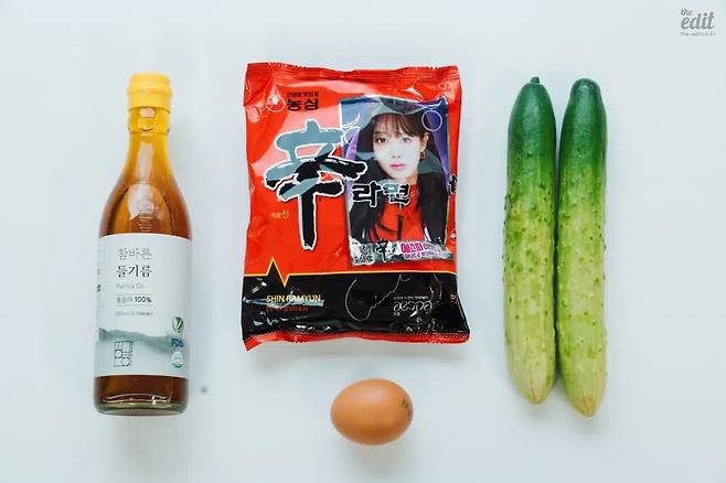 재료는 간단하다. 라면, 오이, 들기름, 계란. 네 가지만 있으면 된다. 레시피 영상 속 임짱의 말에 따르면, 라면과 들기름의 종류는 중요하지 않다. 계란 역시 취향에 따라 넣어도 되고, 넣지 않아도 된다. 대파나 청양고추 등 추가 토핑도 만드는 사람의 자유다. 어떻게 하든지 맛있을 거라는 자신감… 왠지 이 레시피에 믿음이 간다. 나는 영상에서 사용한 신라면과 평소에 먹던 들기름을 준비했다.
