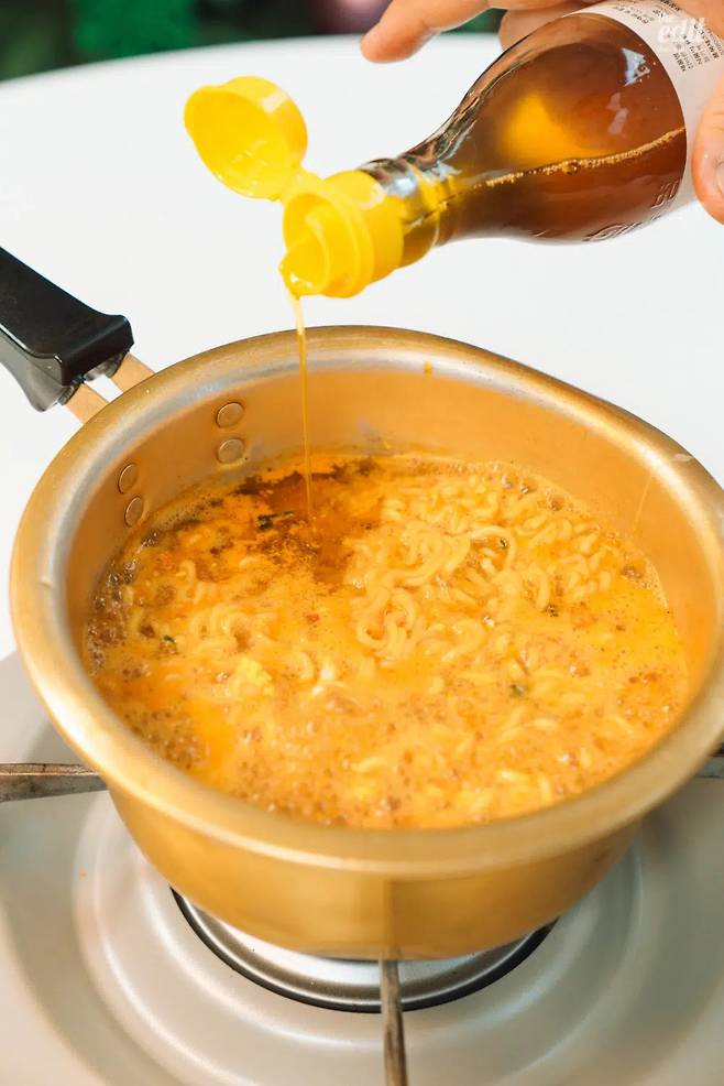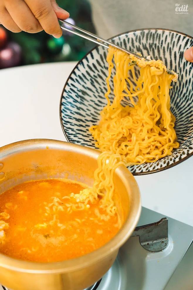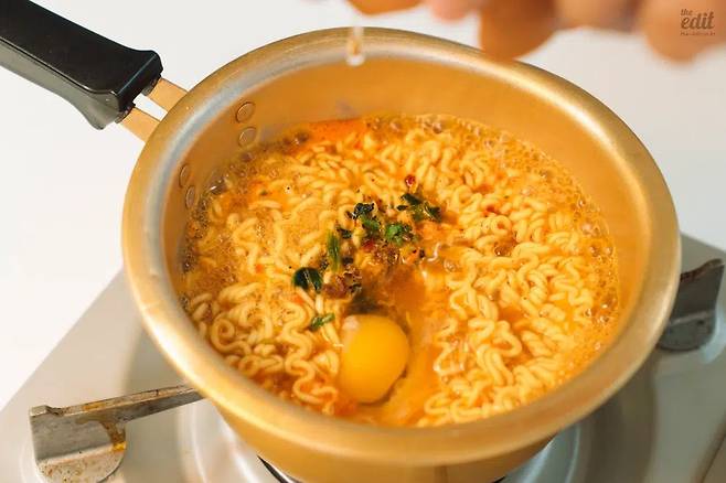 끓는 물에 면과 수프를 넣고 면이 절반 정도 익을 때까지 끓이다가 계란을 넣는다. 여기까지는 평소 라면 끓일 때와 동일하다. 참고로 물의 양은 줄이거나 더 넣지 않고 정량대로 하니 딱 맞았다.