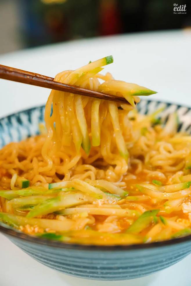 건져 둔 면 위에 오이가 든 국물을 그대로 부어주면 임짱표 들기름 오이 라면 완성! 이게 뭐라고 다들 그렇게 난리인지… 드디어 직접 맛볼 차례다.