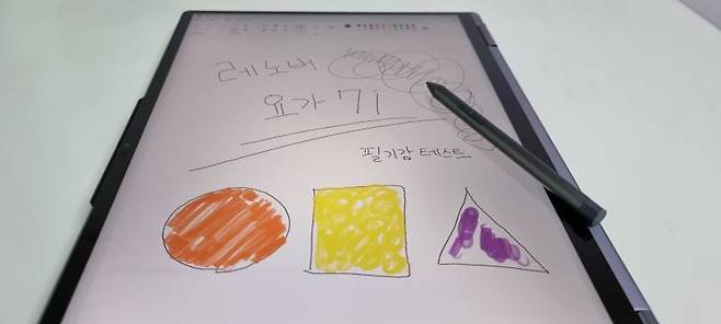 화면을 완전히 돌린 태블릿 모드에서는 펜을 보다 안정적으로 쓸 수 있다. 요가 7i용 펜은 펜촉이 단단하고 필기 중 살짝 눌리는 형태인데, 딱딱거리는 소음 없이 부드러운 필기가 가능했다. 다만 다소 애매한 버튼 위치 탓인지 버튼이 눌려 오작동하는 경우들도 있었다. 또 별도의 펜 거치 공간이 없다는 점도 아쉬운 대목이었다.