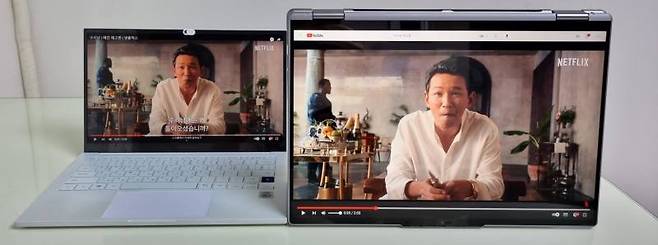 또 상판과 하판이 각도에 따라 각각 지지대 노릇을 할 수 있는 2in1 모델의 특성상 별도의 거치대 없이도 가로든 세로든 노트북을 세우는 곳이 곧 'TV존'이 된다. 더불어 꺾이는 화면은 주변 조명에 따른 화면 빛 반사에 대응하기 쉽고, 화면 꺾임 사고로 인한 고장 걱정도 없다는 부가적 이점이 있다.