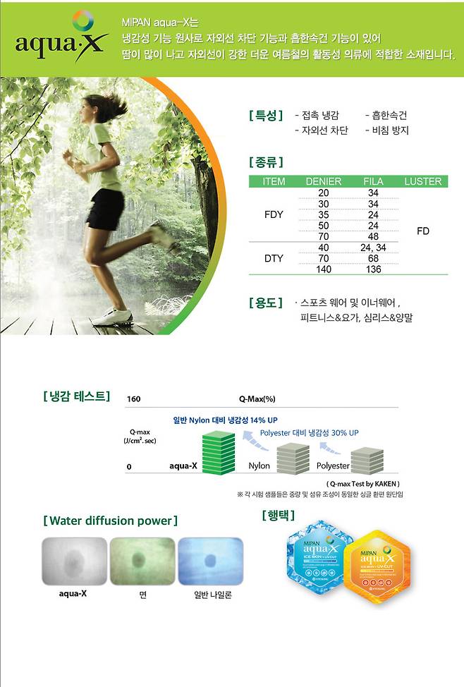 aqua-X 원사는 자외선 차단 기능과 흡한속건의 기능이 있어 여름철에 적합한 소재입니다!