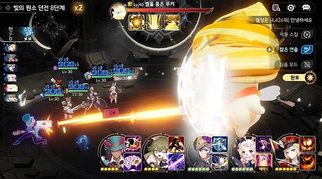 보스는 기본적으로 광역 감전 스킬을 사용하므로, 감전 면역을 지닌 클로에는 반드시 포함되어야 한다. 또 ‘푸키 빔’ 사용 시 마법 공격력이 100% 증가하는 버프가 부여되기에, 해당 스킬 이후 조커의 ‘마술 모자’를 잊지 말고 사용해줘야 한다.