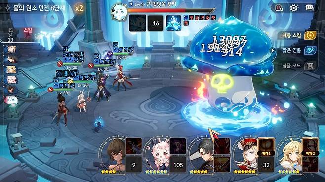 물의 원소 던전중독 위주의 딜러 세팅, 클로에와 빙결 면역은 필수 '물의 원소 던전'에선 '빙결 면역' 효과를 지닌 영웅이 필수다. 전체 공격 사용 시 100% 확률로 빙결 효과를 부여하기 때문이다. 약점 속성은 '중독'으로, 해당 효과는 중첩이 가능하다. 푸키가 '물방울 박치기' 스킬 사용 시 체력을 회복하는 기믹이 있어, 광폭화를 방지하기 위해 회복 불가 효과를 부여할 수 있는 영웅을 팀에 편성해야 한다.
