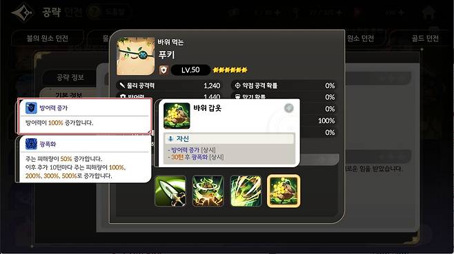 땅의 원소 던전레이드 덱으로 해결 가능, 화상 딜러를 선택 ‘땅의 원소 던전’에서 필요한 필수 요소는 기절 면역, 화상, 방어력 감소 효과다. ‘바위 먹는 푸키’는 패시브 효과로 방어력이 100% 증가하기 때문에, 에이스나 바네사 등 방어력 감소 효과를 지닌 영웅이 필요하다. 화상 효과를 지닌 딜러 영웅으로는 무료로 배포된 레이첼을 필두로 제이브를 사용하는 것이 베스트다. 만약 제이브가 없다면 유리, 스니퍼, 벨리카로 대체할 수 있다.