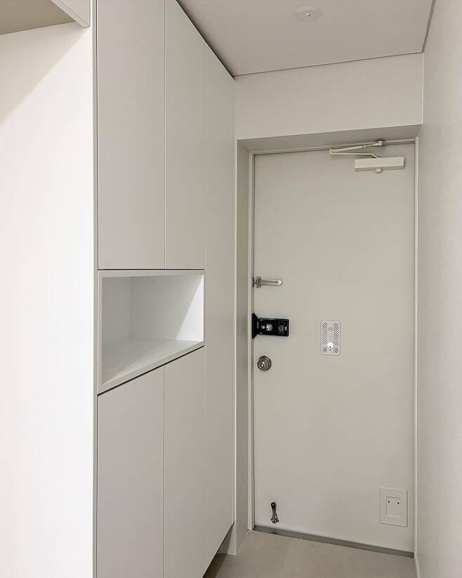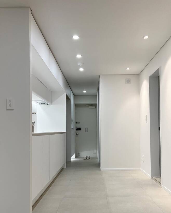 인테리어 공사가 막 끝난 현관의 모습입니다. 현관에서 주방까지 이어지는 공간은 갤러리로 가는 복도 같은 느낌을 주고 싶었어요. 그래서 색을 최소한으로 쓰고, 눈길을 끄는 디테일을 최소화해 전체적으로 공간이 심플하고 깔끔한 느낌을 주도록 만드는 데 집중했어요.