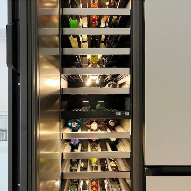 비스포크 냉장고를 구매하면서 와인 셀러도 함께 구매했어요. 와인 뿐만 아니라 칵테일 재료들도 여기에 같이 보관하고 있어요.