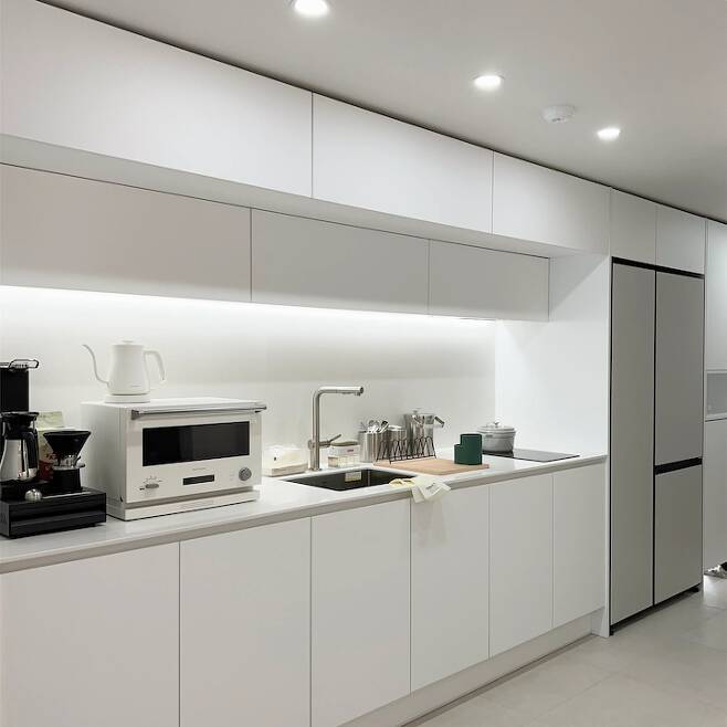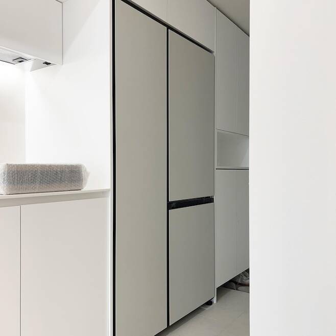 냉장고도 라이프 스타일에 맞춰 삼성전자의 비스포크 투 도어 제품을 구매했어요. 인테리어 계획 단계에서부터 미리 제품을 골라 둔 덕분에 현관부터 주방까지 딱 떨어지게 라인을 맞출 수 있었어요.