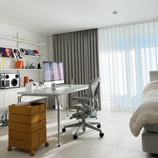 책상 뒤쪽으로는 침대와 행거를 배치했어요. 일하는 공간을 우선시하다 보니 침대와 행거는 되도록 작은 제품으로 골랐는데요. 침대는 더블 사이즈나 퀸 사이즈를 살까 잠깐 고민도 했지만 결국 슈퍼 싱글 사이즈를 선택했어요. 억지로 좀 더 큰 사이즈를 넣으려면 넣을 수 있었겠지만, 그렇게 하면 공간의 전체적인 밸런스가 깨질 것 같았거든요.