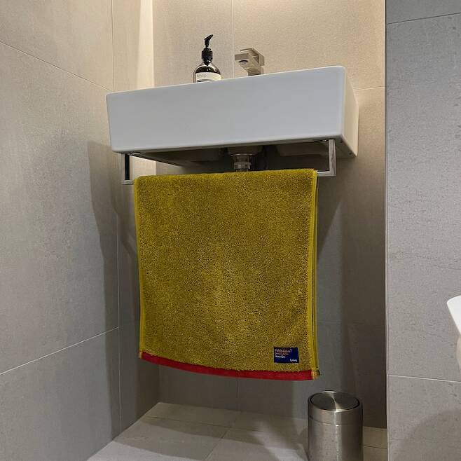 좁은 화장실에 따로 수건걸이와 같은 잡다한 물건들이 여기저기 보이면 더 좁아 보일 것 같아 수건걸이 일체형 세면대를 골랐어요. 그리고 사이즈도 너무 작지도, 크지도 않은 제품을 골라 세면대가 변기 쪽으로 튀어나오거나 저 공간이 너무 좁게 보여지지 않도록 신경 썼어요.