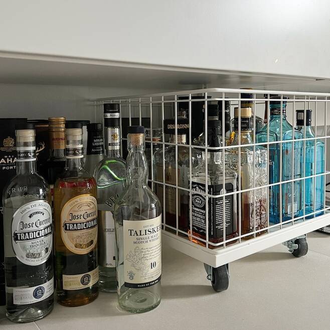선반 아래에는 즐겨 마시는 술들을 놓아두었어요. 대부분 술은 따로 와인 셀러에 보관하고 있지만, 눕혀 보관하면 안 되는 술들이 있어서 그런 술들을 보관하기 위해 따로 만들어둔 공간이에요. 일주일에 한 번 정도 친구들이나 크리에이터들을 초대해 칵테일을 대접하는 게 취미거든요. 혼자 칵테일을 만들어 마시기도 하구요.