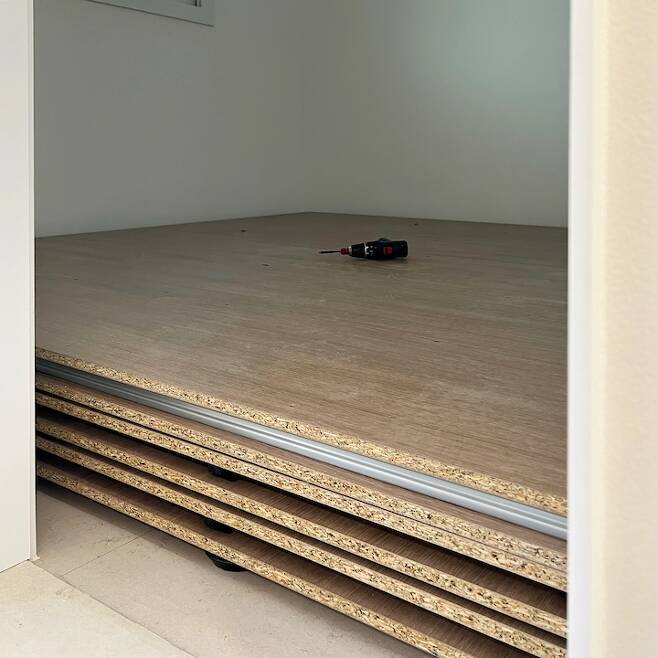 따로 특별히 신경 쓴 부분이 있다면 벽 선반을 설치하기 위해 목공 단계에서 합판으로 미리 보강을 해뒀다는 점이에요.