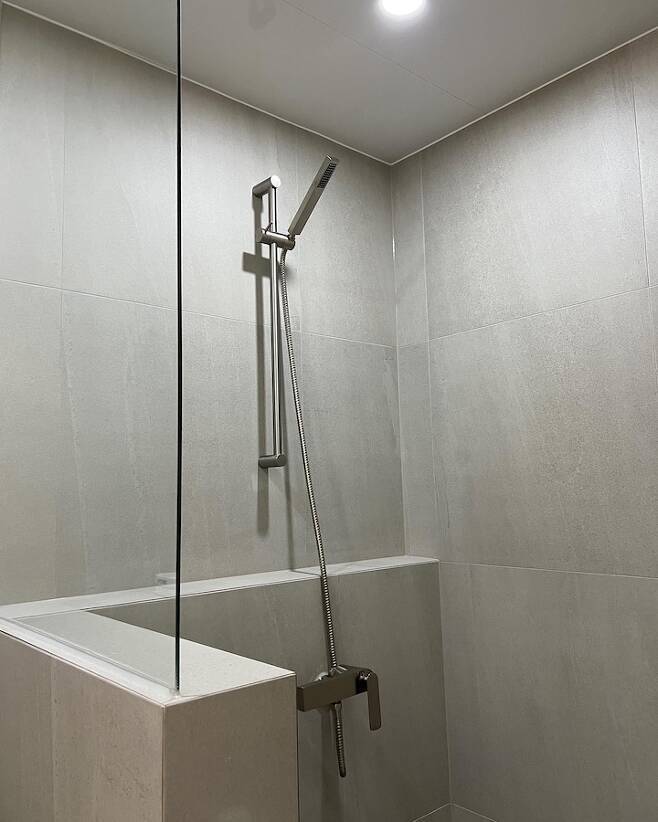 화장실에서 또 한 가지 포인트가 되는 건 파티션이에요. 화장실을 건식으로 사용하고 싶어서 변기와 샤워 공간 사이에 파티션을 설치했어요.