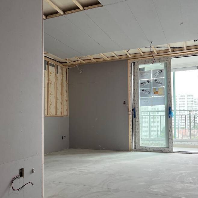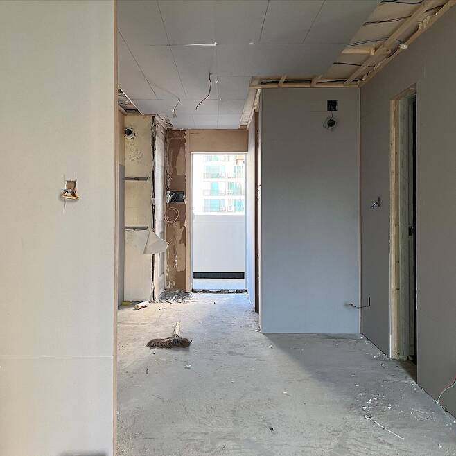 철거 후 목공 공사가 어느 정도 진행됐을 때의 모습이에요. 아직 가구들이 들어오기 전이지만 확실히 불필요한 디테일을 없애고 선을 깔끔하게 맞추니 전보다는 훨씬 정돈된 느낌이 들기 시작하더라구요.