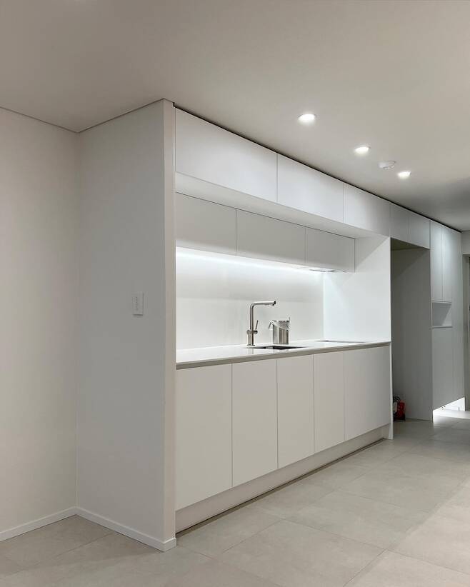 중간에 눈에 걸리는 부분이 없도록 상부장, 하부장과 신발장의 라인을 맞춰줬고, 바닥 타일도 현관, 주방, 큰 방, 베란다를 모두 같은 타일로 깔아줬어요. 천장 등도 현관부터 주방, 큰 방까지 일자로 이어지도록 라인을 맞춰주었구요. 화장실 양 옆에는 갤러리 같은 느낌을 주기 위해 주황빛이 감도는 COB 다운 라이트를 시공해 주었어요.