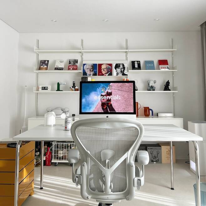선반에는 제가 존경하는 분들의 초상화와 자주 읽는 책들을 진열해두었어요. 보통 책은 전자책으로 많이 읽는 편인데, 감명 깊게 읽은 책들은 따로 종이책을 사서 모으고 있어요. 모은 책들은 매주 바꿔가며 진열하고 있는데요.