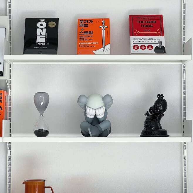 너무 책만 진열해두면 답답하고 심심할 것 같아 제가 좋아하는 오브제들도 함께 진열했어요. 이 중에서도 특히 애정하는 건 카우스의 피규어에요. 첫 눈에 보자마자 반해서 바로 구매한 피규어인데, 기대했던 것보다도 공간에 잘 어울려서 만족스러워요.