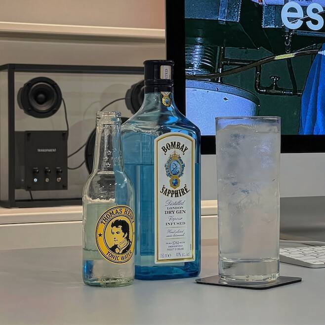 가장 좋아하는 건 진, 그 중에서도 봄베이 사파이어를 좋아해요. 그래서 항상 첫 잔은 봄베이 사파이어로 만든 진 토닉을 만들어 마셔요.