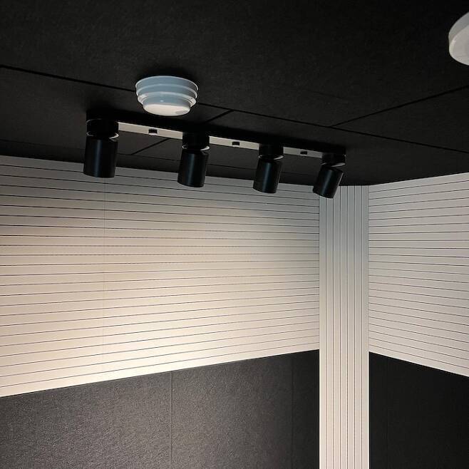 스튜디오 내부 모습이에요. 전체적인 집의 컨셉이 올 화이트니까 부스도 비슷하게 꾸며볼까 하다가 스튜디오는 바깥과 단절된 느낌이 강한 만큼 색다른 느낌을 내봐야겠다는 생각이 들었어요. 큰 방과는 다른 느낌으로 연출하면 오가며 일할 때 분위기 전환이 될 것 같기도 했구요. 그래서 기본적으로는 올 블랙으로 꾸미되, 집의 전체적인 컨셉과 통일감을 주기 위해 화이트를 섞어 블랙&화이트 컨셉으로 꾸며봤어요.