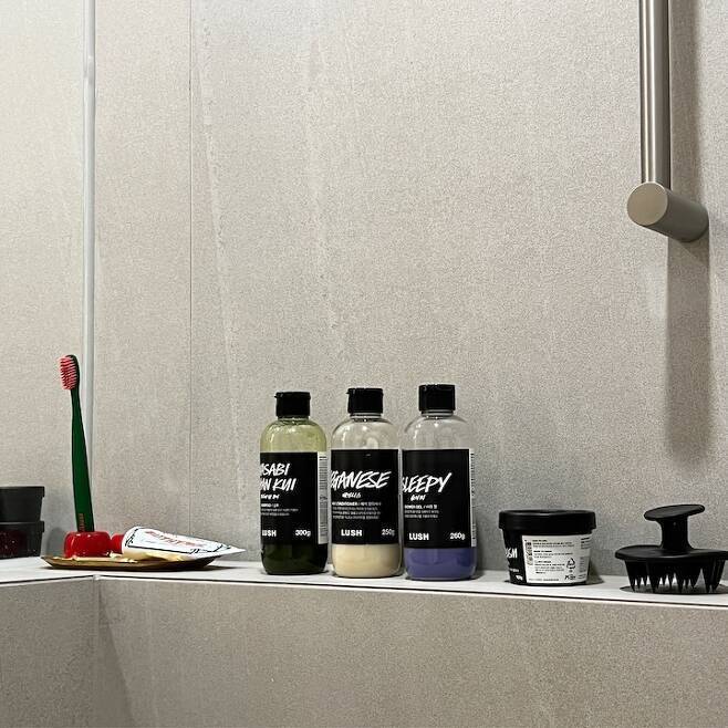 이렇게 선반 공간을 넓게 만들어 둔 덕분에 별도의 벽 선반을 설치하지 않아도 돼서 화장실을 전체적으로 좀 더 넓어 보이게 연출할 수 있었어요.